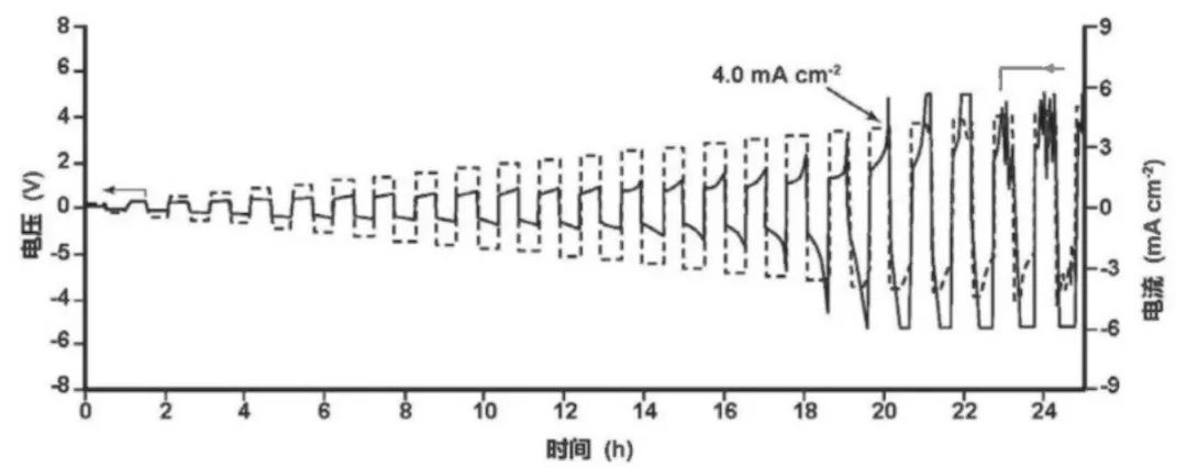 中图显示临界电流密度测试达到 4.0 mA/cm2,而没有夹层的电池为 0.9 mA/cm2。
