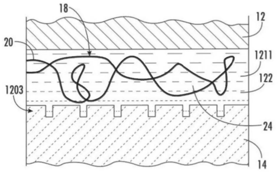 上图显示了层间集成示意图,其中复合前驱体层(1211)可穿透固态电解质(14)中的孔隙(1203)。